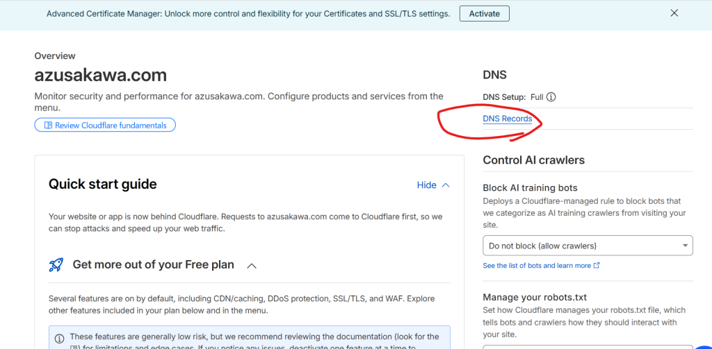 ドメインの管理画面に行く。DNS Recordsを押す。