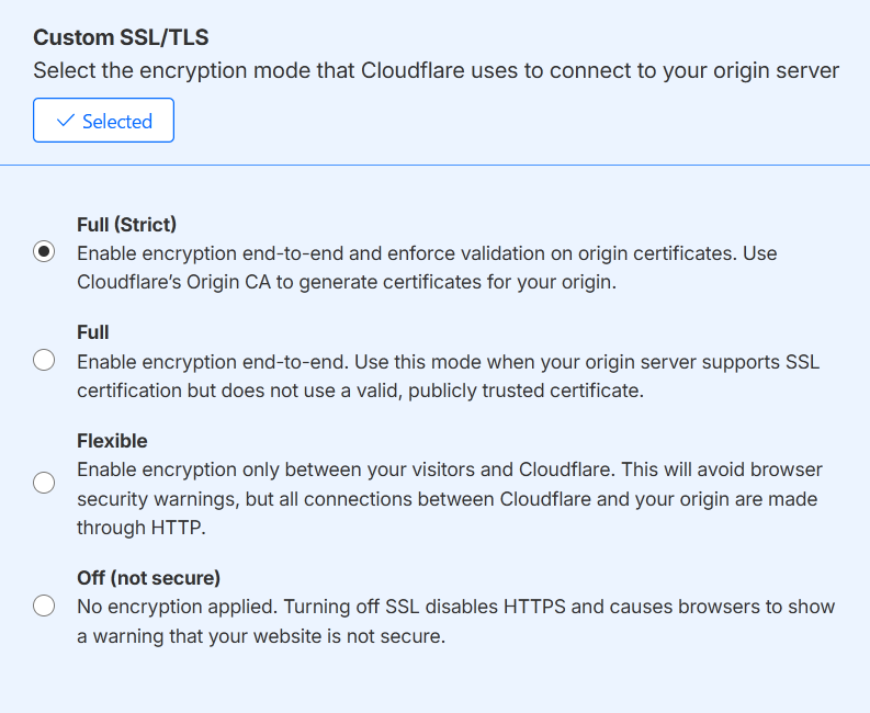 「CloudflareでTLS対応させる」には4種類あります。それぞれ以下の通りです。私はFull(Strict)を選択しました。