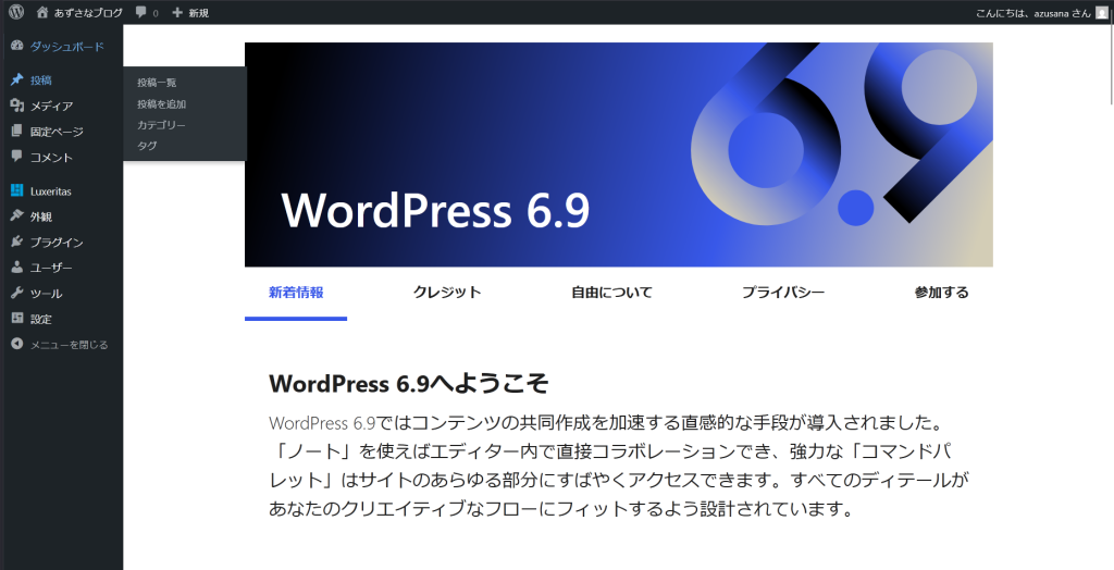 標準のテーマでも良いですが、今回はLuxeritas というテーマを使います。GUIの管理画面から設定できるので特に難しくはなかったです。