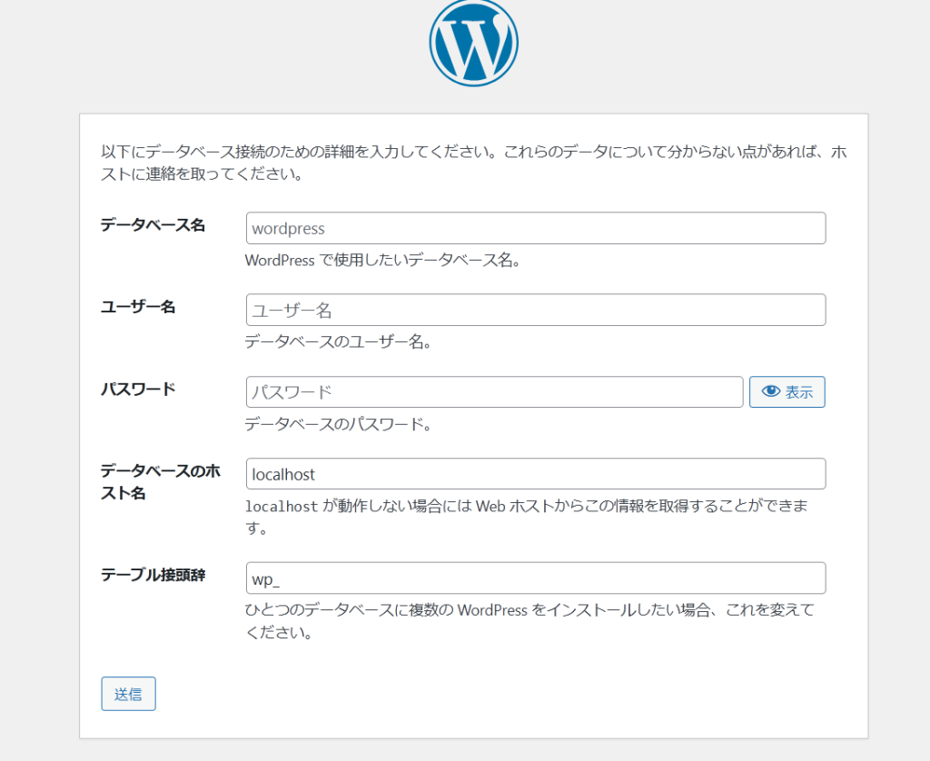 さっき、MySQLに設定した奴を入力します。次に送信→インストール実行と押せば進みます。